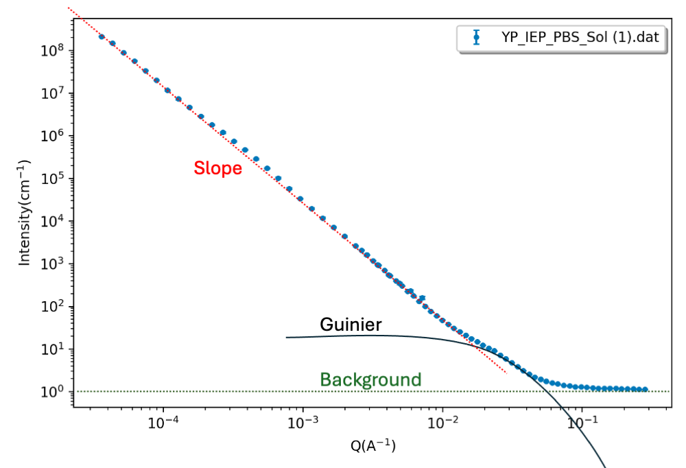- High-q region: the slope at high q values is approximately -4, which is the Porod limit for smooth surfaces.Rough surfaces give steeper slopes.